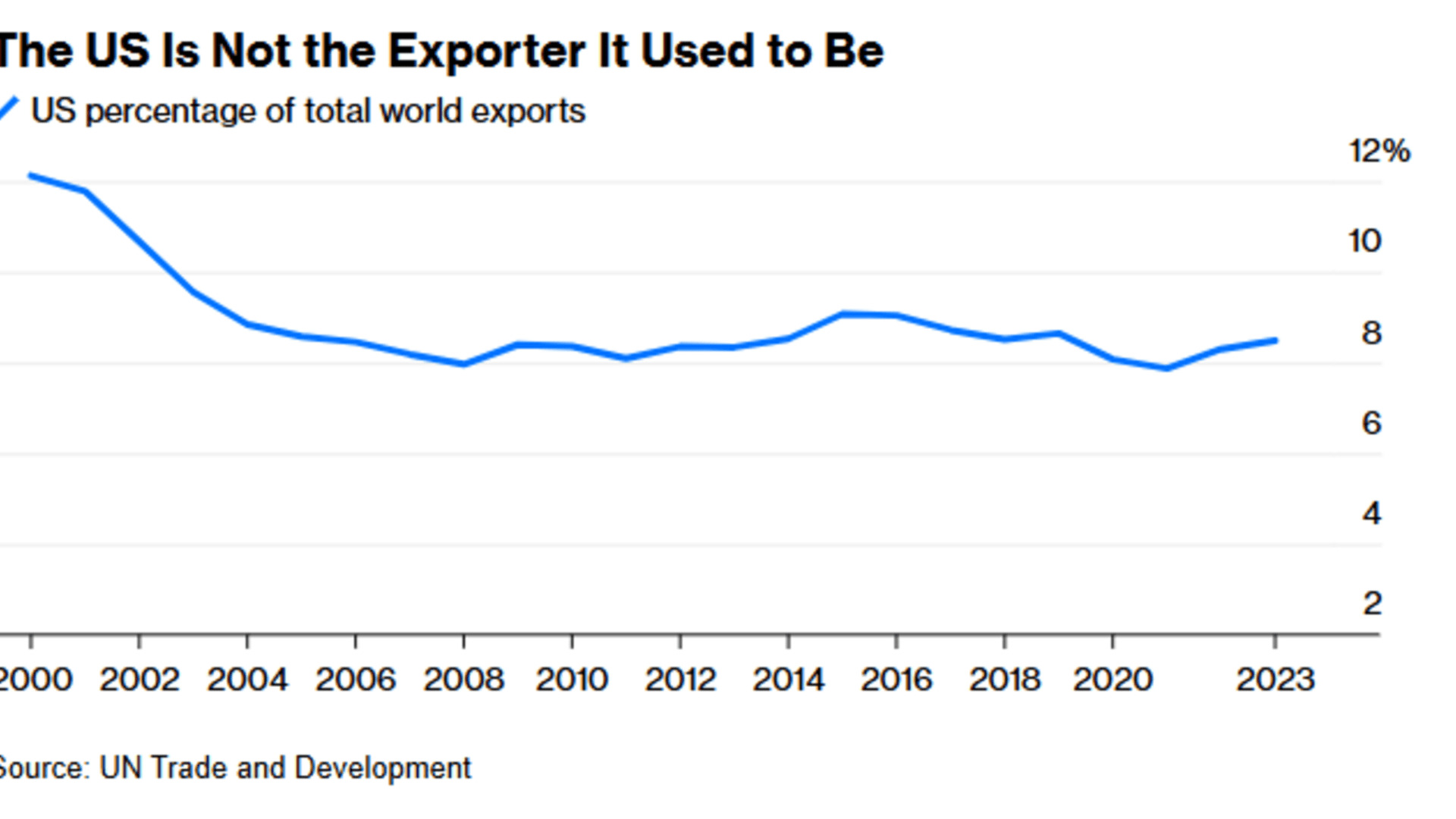 Despite the outsized economic benefits of exports, the US has been losing global market share: Its share of international sales in 2023 was less than 9%, down from 12% in 2000. Domestic costs and barriers are partly to blame. Despite a bounty of energy, for instance, prices are still high compared with industrial rivals China, Vietnam and Mexico. Wages, even when factoring in the higher productivity of US workers, outpace those of many competitors, as do US corporate tax rates. And for many industries, including mining, refining and chemical manufacturing, regulatory and other hurdles make it harder to set up shop.