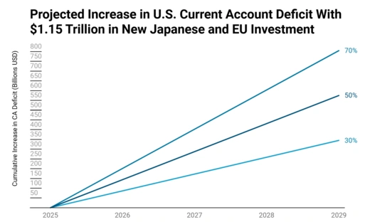 To see how significant the error is, consider the likely impact of $1.15 trillion in new, unanticipated inward investment between now and the end of 2028. An increase in the capital account surplus must be matched by an increase in the current account deficit of the same magnitude. In practice, however, only part of the inflow tends to show up in the current account over a short window like 3.5 years. Very roughly, empirical research suggests that 30-70 percent of large capital inflows show up in the current account over 3-5 years, depending on the type of inflows (FDI, portfolio, or bank loans) and macroeconomic conditions. If we assume, then, that half of the inflows translate into a wider current account deficit over 3.5 years, then $1.15 trillion in new inward investment from Japan and the EU would add a cumulative $575 billion to the current account deficit—or $165 billion per year. The graphic above shows the progression of that cumulative increase going forward under the assumptions of 30 percent, 50 percent, and 70 percent pass-through.