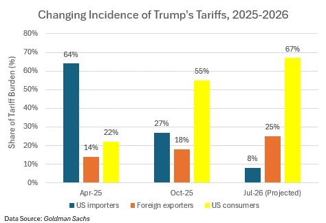 A range of studies have attempted to estimate the proportion of tariff costs borne by each of these three groups. I take estimates from multiple Goldman Sachs reports, corroborated against others produced by Yale Budget Lab’s State of U.S. Tariffs (July 14, 2025) and Allianz Trade’s U.S. Business Barometer (May 2025), and amalgamate them in the graphic above—which shows how these proportions change through time.