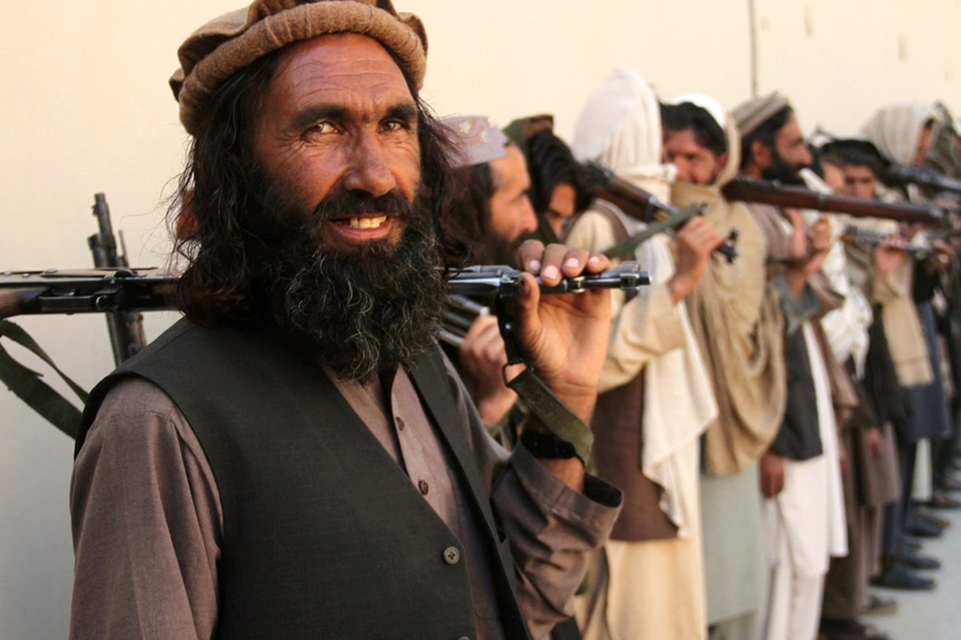 Taliban fighters in eastern Nangarhar Province attend a surrender ceremony in 2016. Rahman Safi/Xinhua via Getty Images