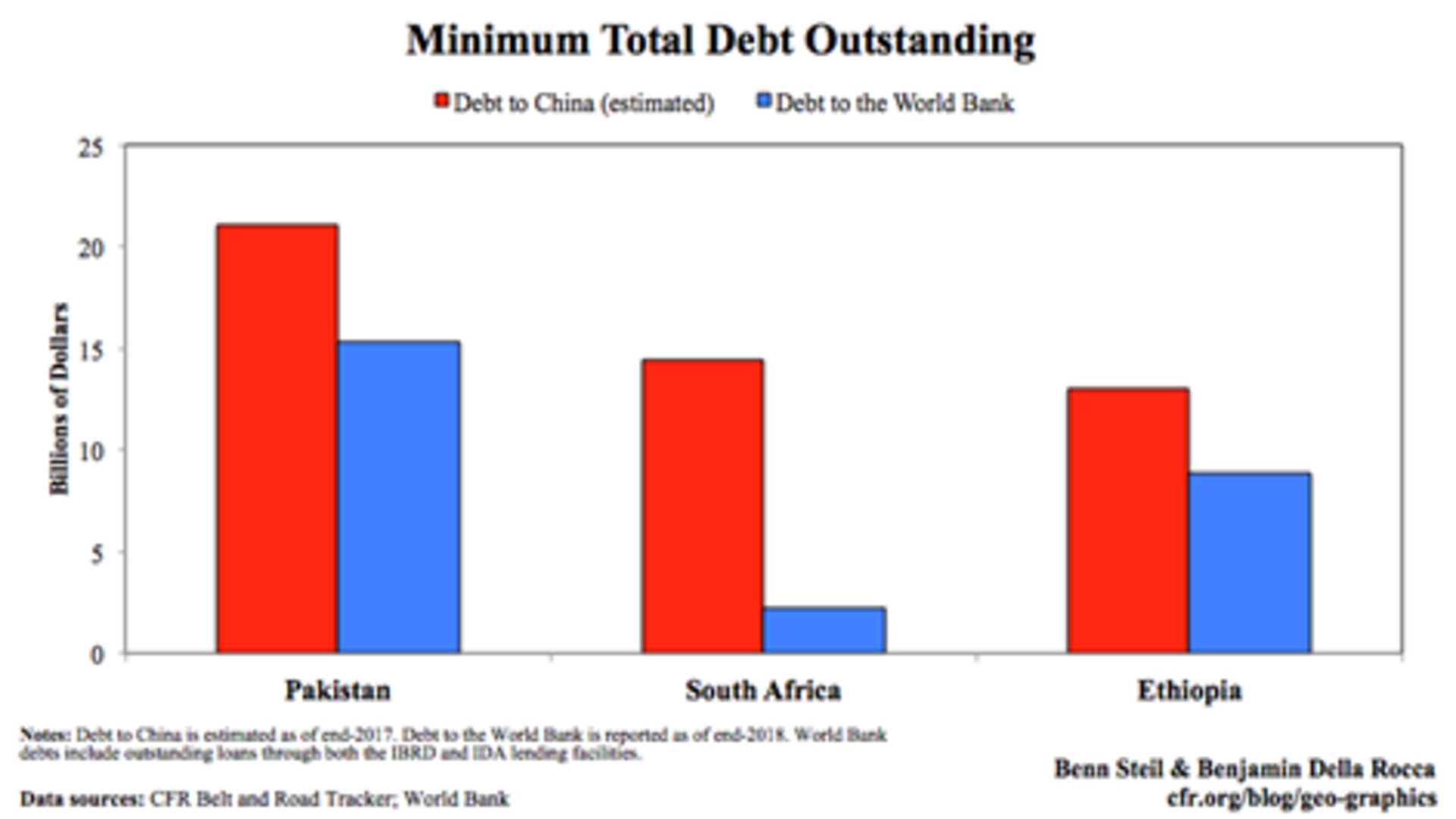 While the World Bank is disbursing emergency aid to its poorest borrowers, China—a major World Bank borrower, with $16 billion in outstanding loans—continues, effectively, to use cheap World Bank financing to fund its own higher-interest loans to other World Bank borrowers. As the graphic above shows, Pakistan, South Africa, and Ethiopia owe China considerably more than they owe the World Bank. Although China’s BRI loans are shrouded in secrecy, we estimate outstanding BRI debt in 67 countries we were able to track through 2017 at at least $135 billion. Given that more countries have signed on since then, total outstanding BRI debt is probably nearer to the $196 billion owed to the World Bank.