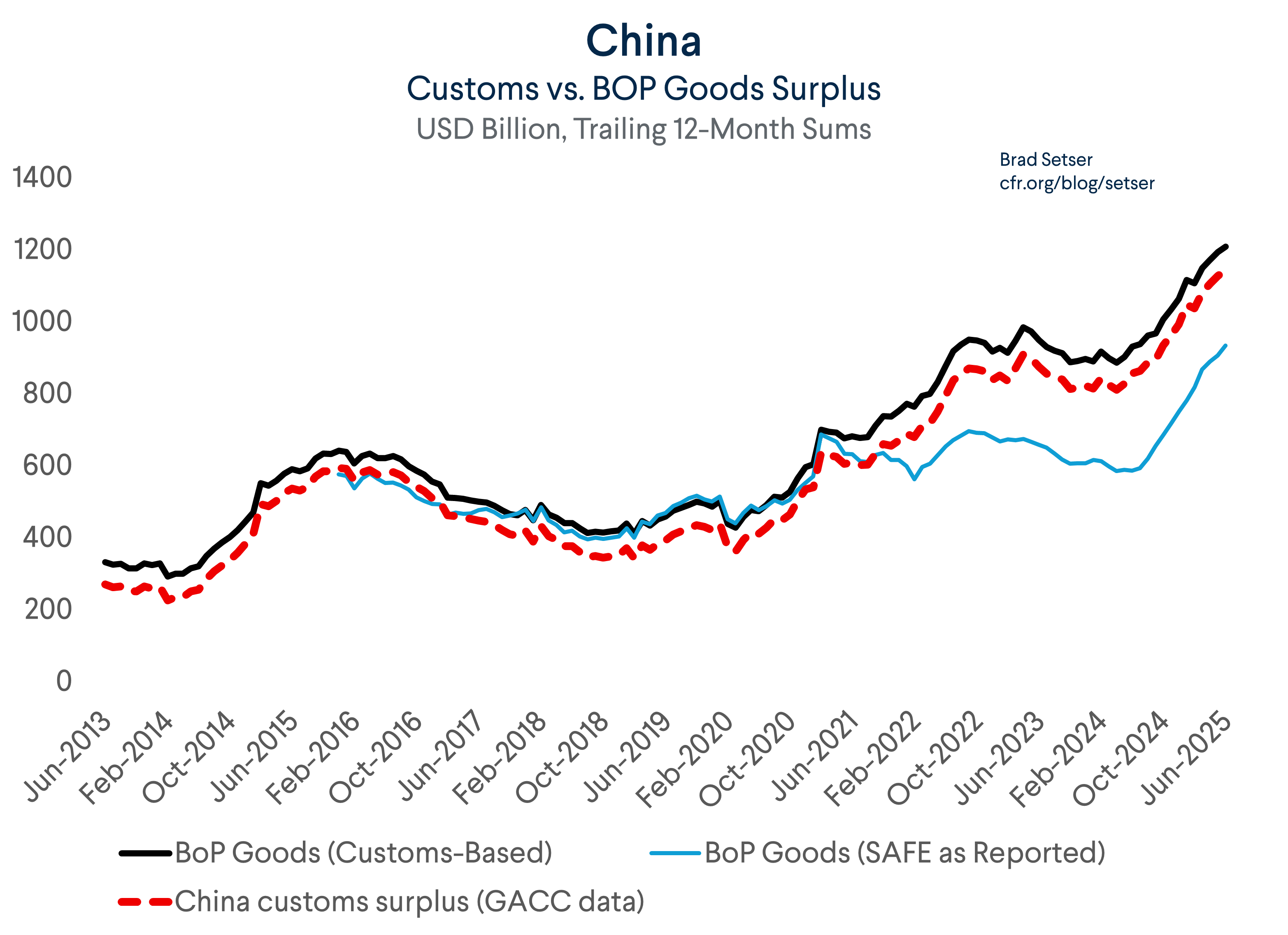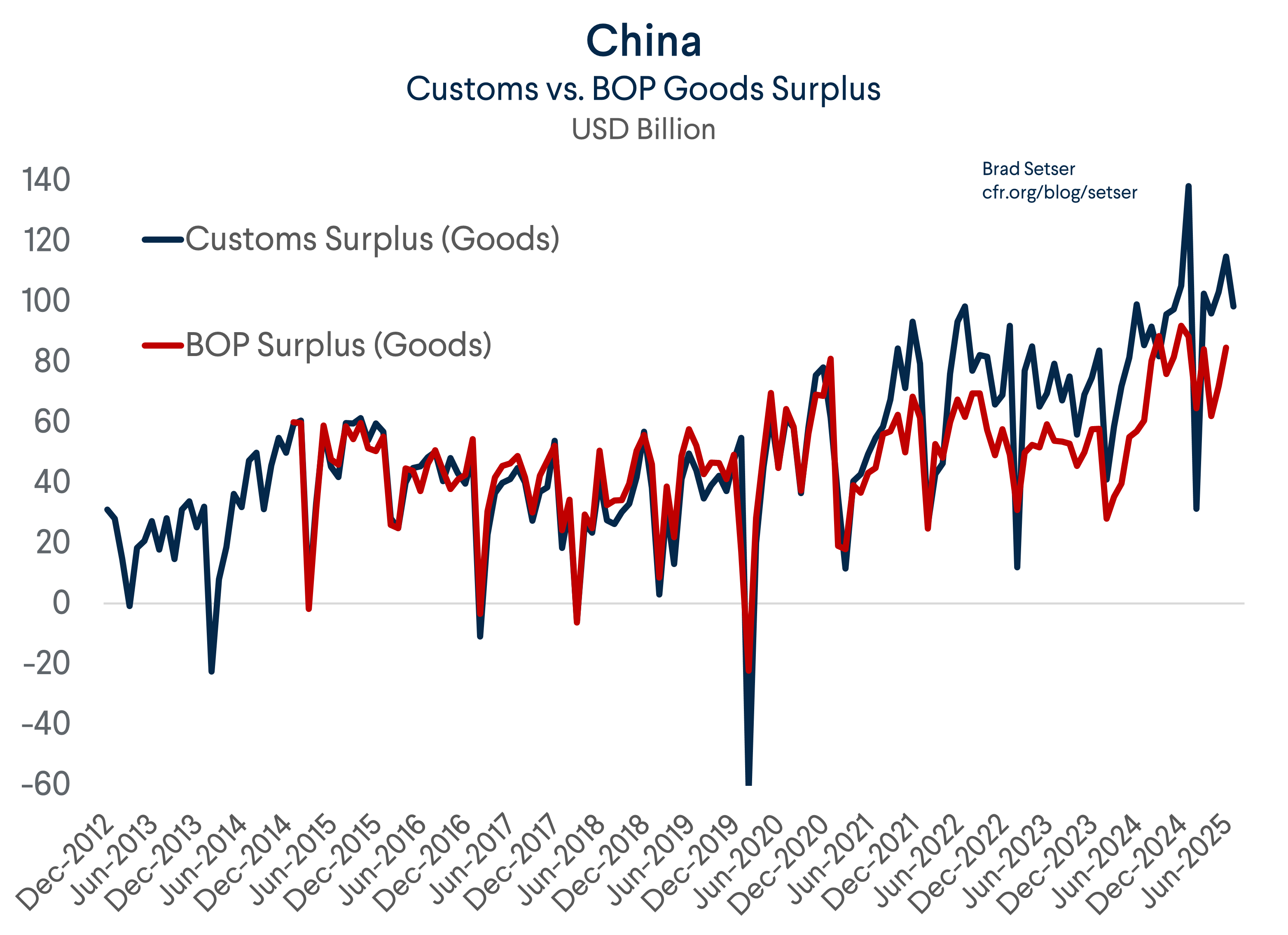 Recall that China’s current account surplus soared in the second half of 2024. That increase reflected ongoing growth in China’s customs surplus and an unexplained reduction in the gap between the customs surplus and the balance of payments data. The gap between the customs surplus and the current account surplus remained relatively small in Q1 2025 before widening again in Q2 2025.