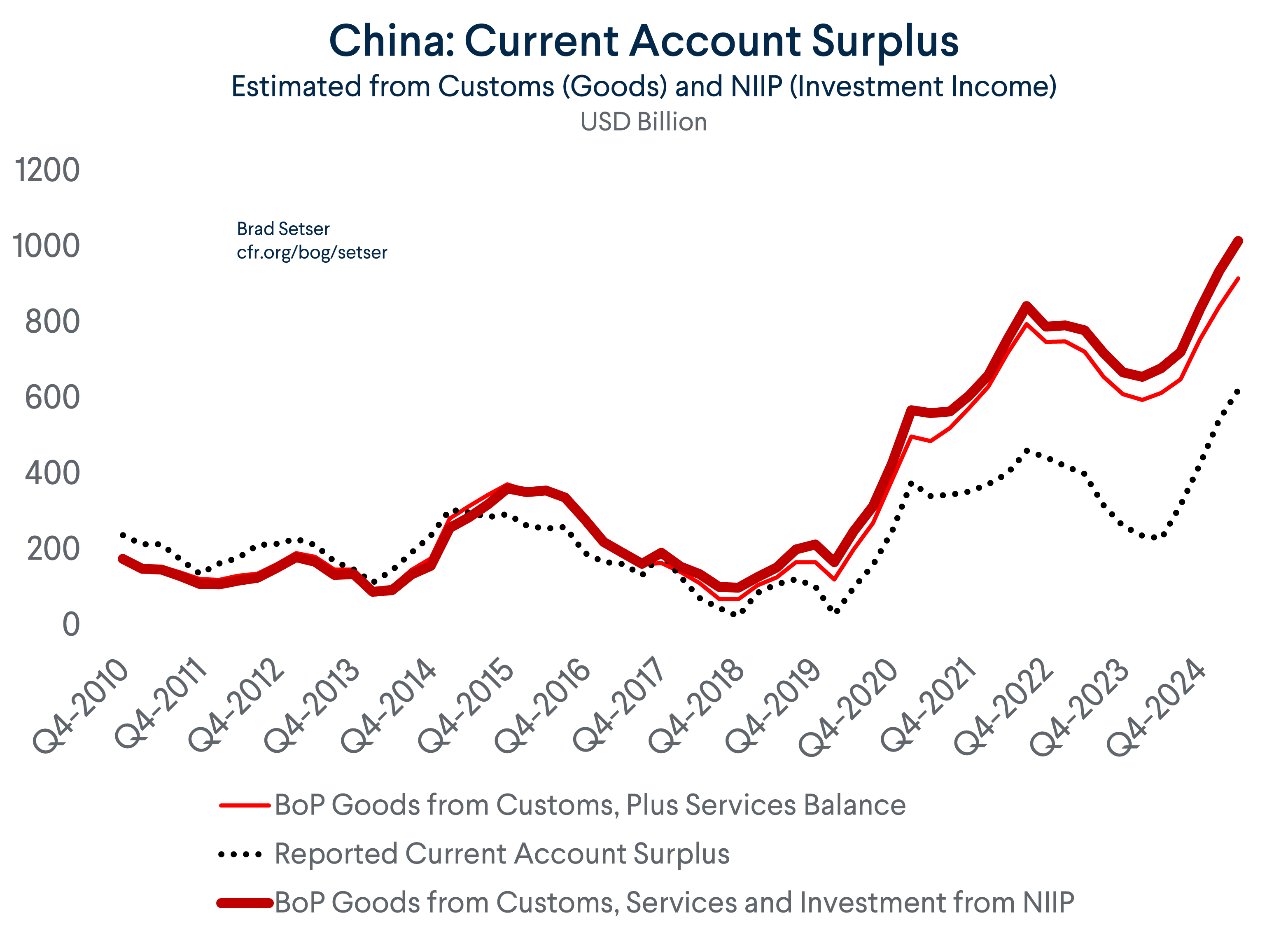 These kinds of unexplained swings continue to impede clear measurement of the scale of China’s internal imbalances and contribution to global trade imbalances. They further explain ongoing doubts about the size of China’s reported current account surplus. That surplus topped $600 billion in the four quarters through Q2 2025, which is almost certainly still significantly understated. A realistic estimate for the current account surplus, using China’s pre-2021 customs-based BOP methodology (which corrects for the puzzling investment income deficit) would put China’s current account surplus around $1 trillion, or about 5 percent of China’s GDP.