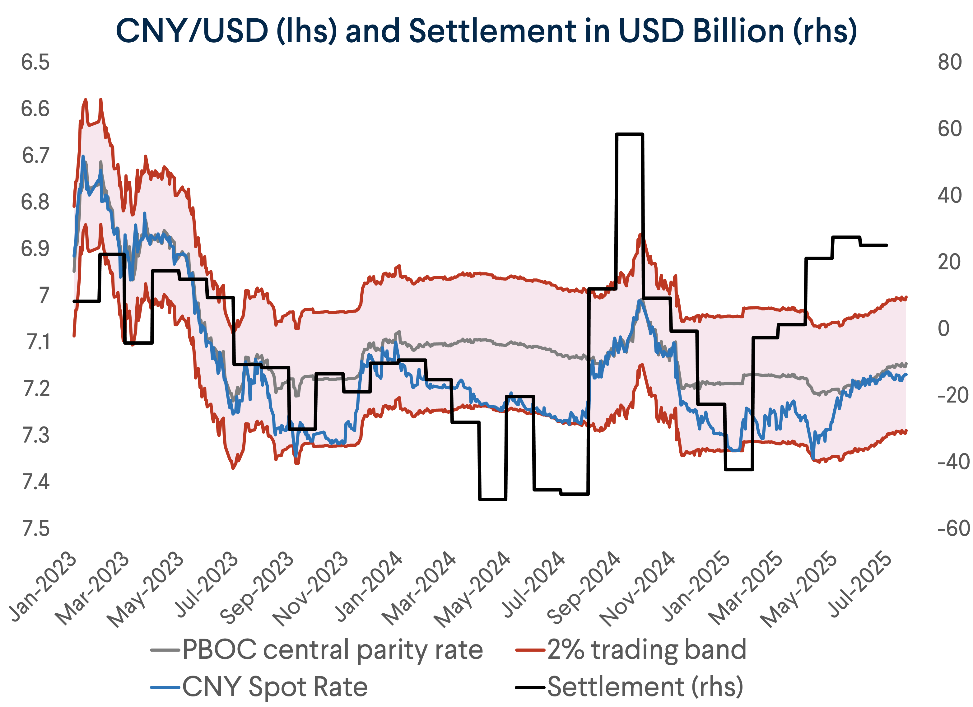 The $74 billion settlement surplus in Q2 was particularly significant, as this data point has historically been the best indicator of China’s broad activity in the foreign exchange market. It thus strongly suggests that the yuan faced appreciation pressure after China decided not to allow a significant depreciation of the yuan in the face of the “Liberation Day” tariffs. There was an additional $37 billion surplus in forward-adjusted settlement in July.