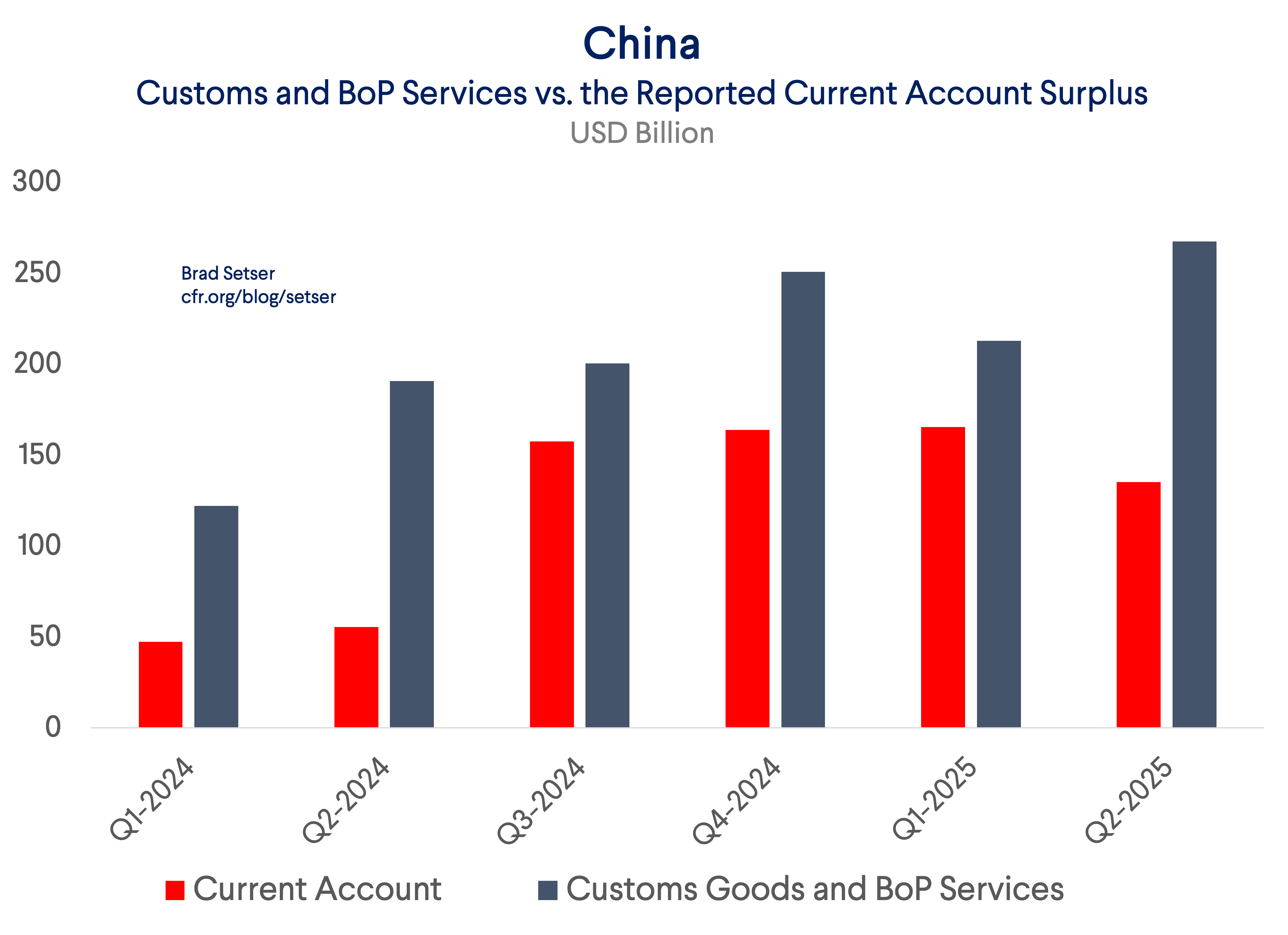 China reported a preliminary current account surplus of $135 billion in Q2, down from $165 billion in Q1. This brought the H1 2025 surplus to $300 billion 2025 and the reported current account surplus in the last four quarters of data to over $600 billion.