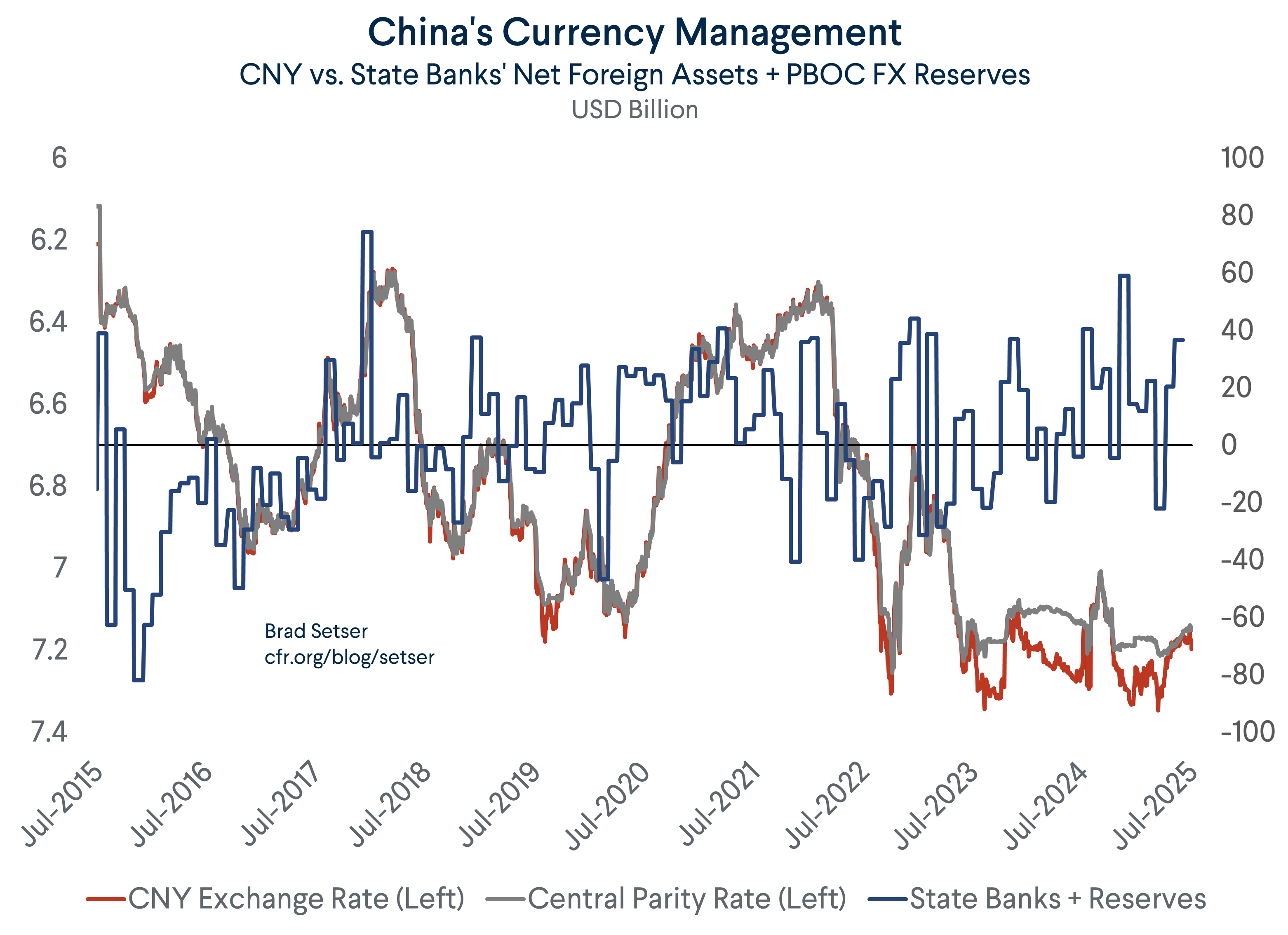 In Q1, the Chinese state banks added $75 billion to their net holdings of foreign assets. That total dipped to $65 billion in Q2, but remained positive even with the “Liberation day” tariffs.