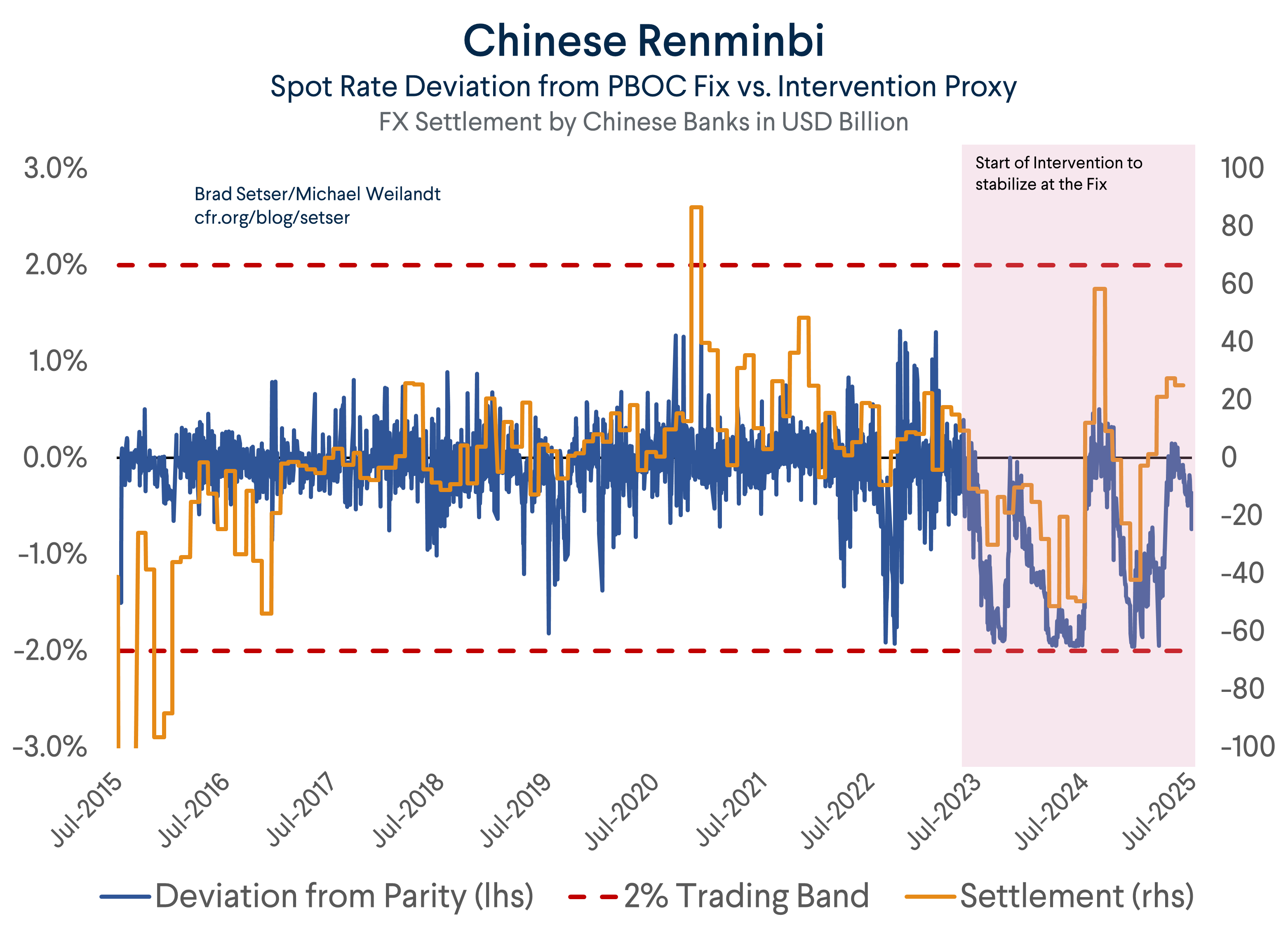There does seem to be a consistent pattern in the settlement data which helps explain the rise in settlement in Q2; namely that settlement has been positive in recent quarters when the onshore spot rate is close to the PBOC’s daily fix (the theoretical midpoint for daily trading).