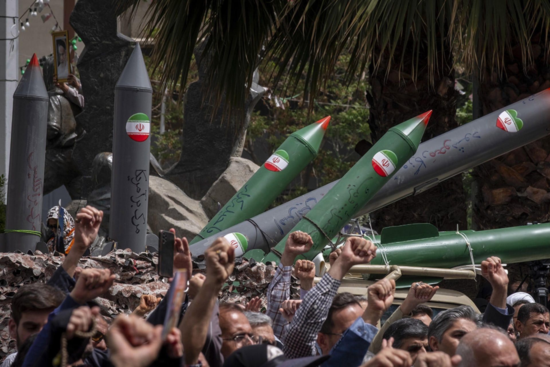 Iranian protesters shout anti-U.S. and anti-Israel slogans while a military vehicle carries a scale model of Iran-made surface-to-surface missiles during an anti-Israeli protest at Palestine Square in downtown Tehran, Iran, on April 9, 2025. Morteza Nikoubazl/Getty Images