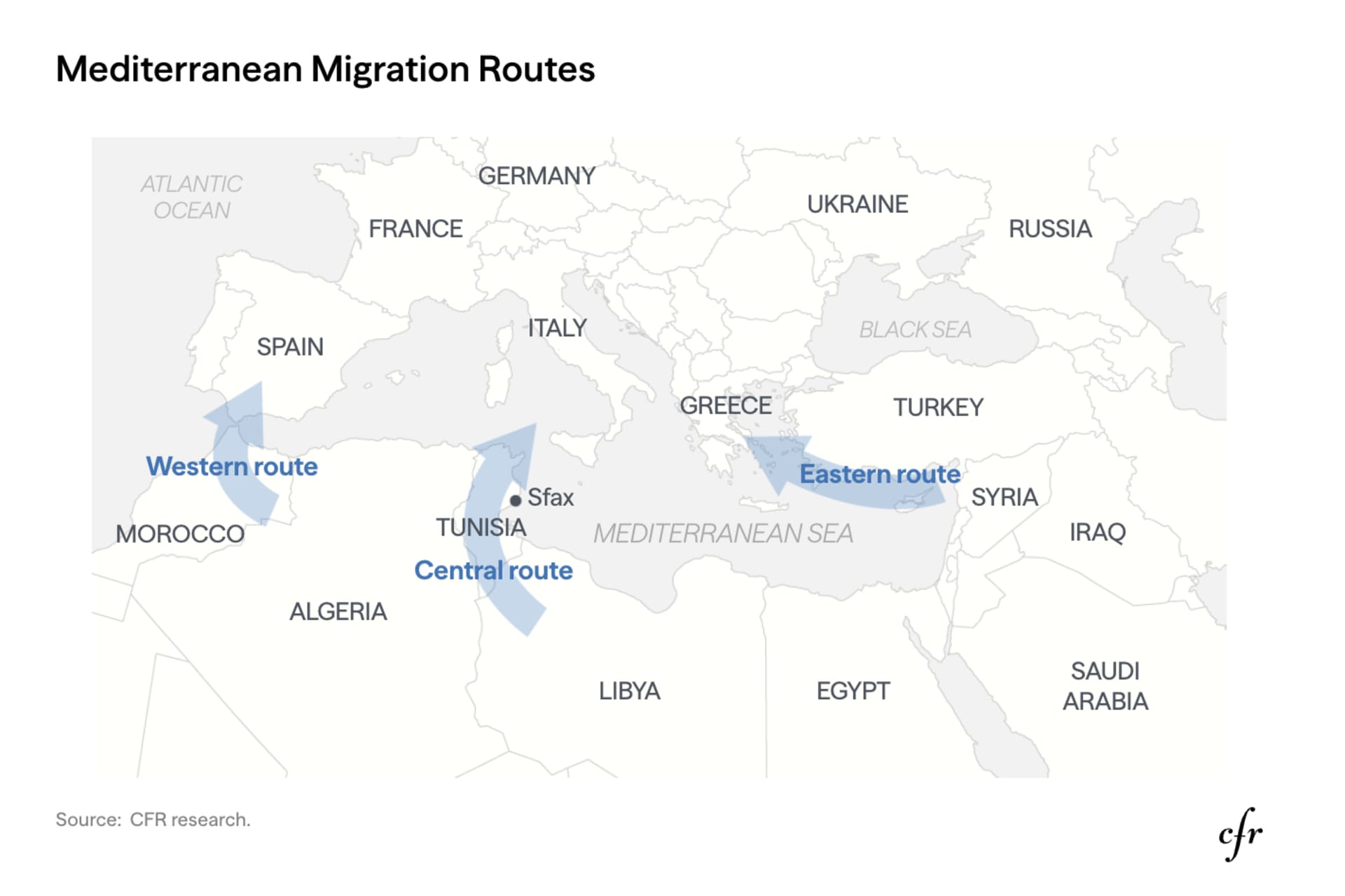 While there are departure points all along the North African coast, many emigrants have converged on the port city of Sfax, Tunisia, as their launch point. This offers a shorter trip—117 miles (188 kilometers)—compared to departures from Algeria, Egypt, Libya, and Morocco, and access to a sophisticated, but illicit, migration economy that Tunisia’s security forces have struggled to control. Those smuggling networks help migrants avoid immigration authorities, but they also often expose them to extortion, trafficking, and sexual violence.