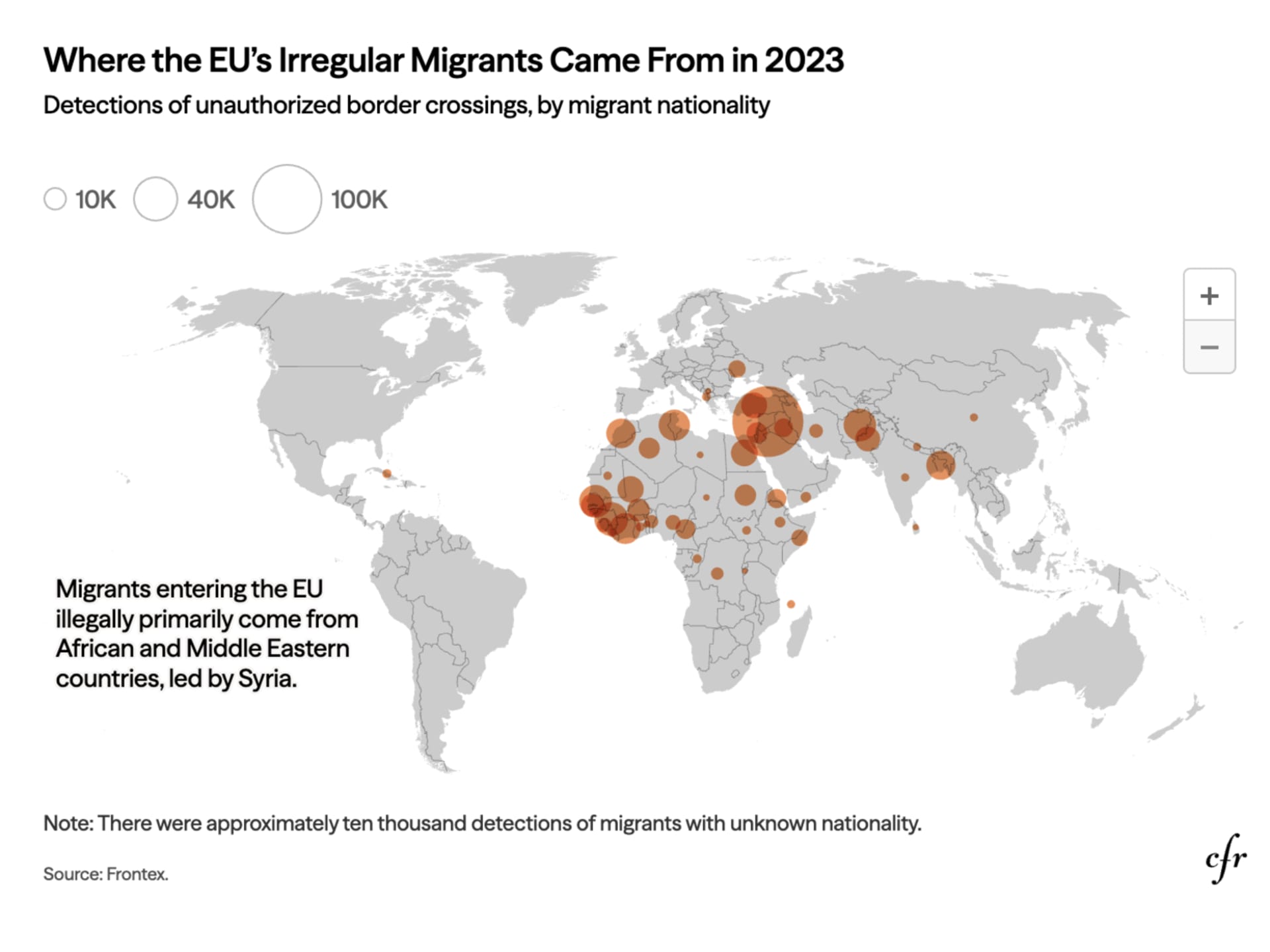 In 2023, Europe received the most irregular migrants from Syria, which has yet to recover from more than a decade of war that has displaced half of its population. The next largest groups were Guineans and Senegalese fleeing economic struggles and political instability in those West African countries, followed by Afghans escaping Taliban rule.