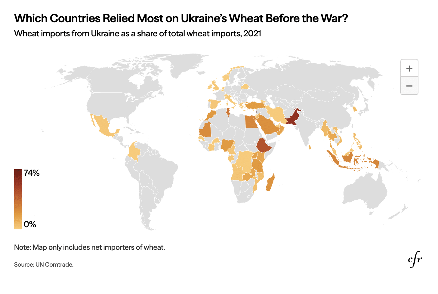 Ukraine sends its grain around the world, but Africa and the Middle East rely heavily on its exports. At least fifteen African countries imported more than half of their wheat from either Russia or Ukraine in 2020.