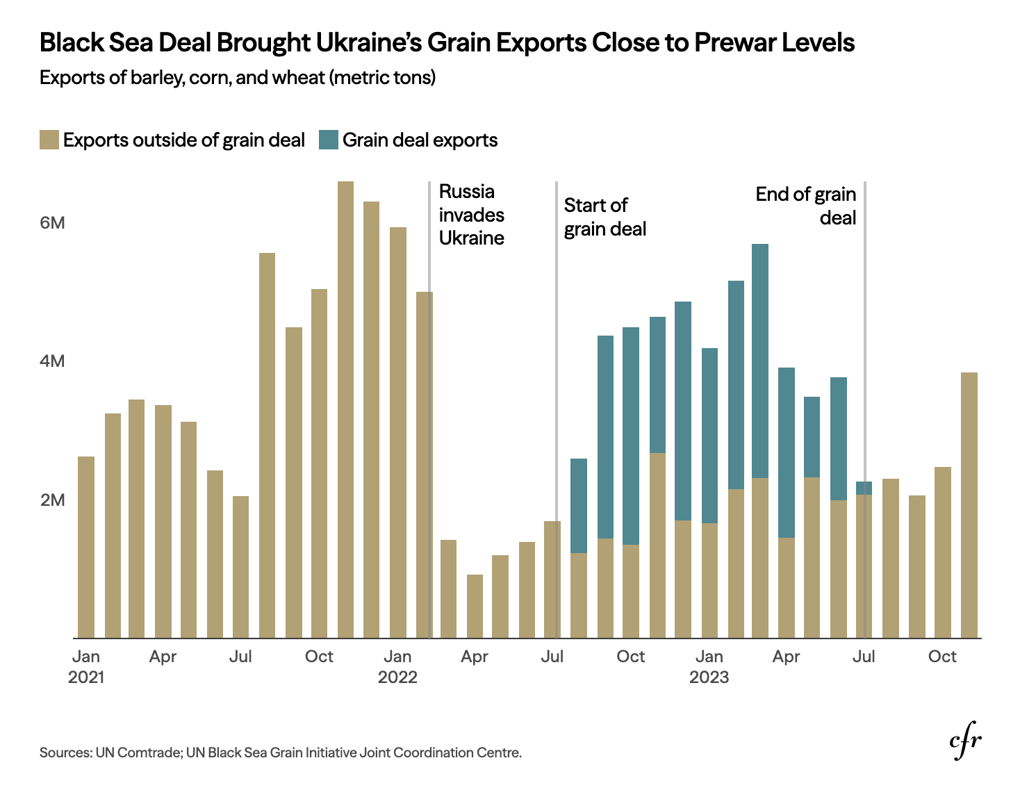 After five months of war, spiking global food prices led Russia and Ukraine to agree to a July 2022 deal to get grain flowing again. Brokered by the United Nations and Turkey (which controls the Bosporus Strait, through which almost all Black Sea trade passes), the agreement provided Ukrainian merchant ships safe passage subject to UN inspection.