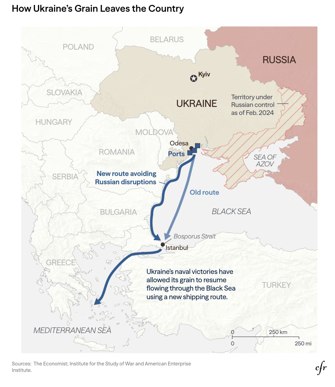 In peacetime, Ukrainian merchant ships chart a direct course across the Black Sea, through Turkey’s Bosporus Strait, and out to international waters. But during the war, commercial vessels have traced the sea’s western coast, along the borders of friendly states such as Bulgaria and Romania. It is difficult for Russian submarines to maneuver in these shallow waters, and the path, near NATO territory, raises the possibility of Russia-NATO military confrontation. While Moscow has not explicitly targeted commercial ships, a few have been damaged by Russian mines.