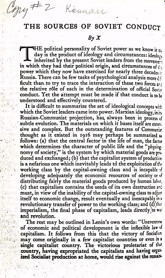 seeks by all means short of war to (1) block further expansion of Soviet power, (2) expose the falsities of Soviet pretensions, (3) induce a retraction of the Kremlin’s control and influence, and (4) in general, so foster the seeds of destruction within the Soviet system that the Kremlin is brought at least to the point of modifying its behavior to conform to generally accepted international standards.