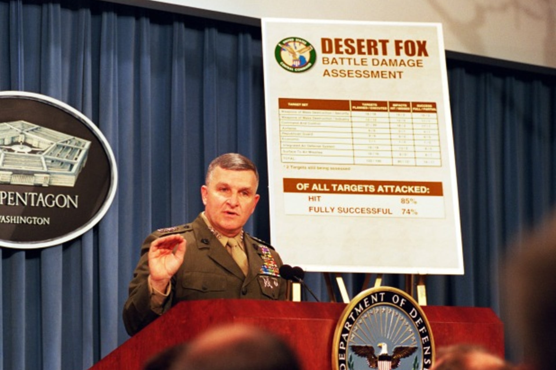 Though the target sets were well known and threat environment minimal, Operation Desert Fox was not a resounding military success. This, despite President Clinton, without prompting, increasing the number of authorized cruise missiles and air sorties initially proposed to him from 300 and 700, to 400 and 800, respectively, according to then-chairman of the Joint Chiefs of Staff Gen. Hugh Shelton. There were 275 aim-points (211 of which were partially or fully struck) amongst the one-hundred planned targets: forty-three targets were severely damaged or destroyed, thirty moderately damaged, twelve lightly, and thirteen untouched. Afterward, Gen. Anthony Zinni, commander-in-chief of U.S. Central Command (CENTCOM), characterized the bombing as “74 percent successful.” Pentagon and CENTCOM officials wanted to restrike several of these targets, but the White House insisted that the bombing be completed by the start of Ramadan. Sen. Cotton would probably not tout Operation Desert Fox so glowingly if he knew it had lasted only four days out of concern for political sensitivities in the Muslim world.