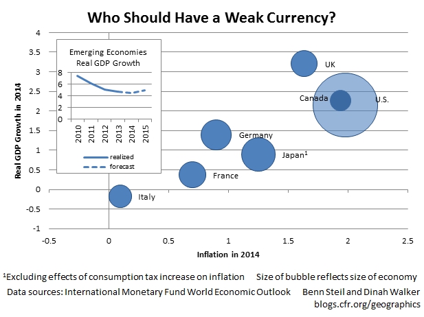 As today’s Geo-Graphic shows, major economies outside the U.S. are in no condition to support stronger currencies. Of the G-7 economies, as the main figure above indicates, only the U.S. and Canada – which have the second- and third-highest growth rates – have inflation near the developed-market standard of 2%. The others, save the UK, have much lower growth and inflation. The U.S. pursuing a weak-dollar policy towards its G-7 partners, therefore, would appear deeply damaging and misguided.