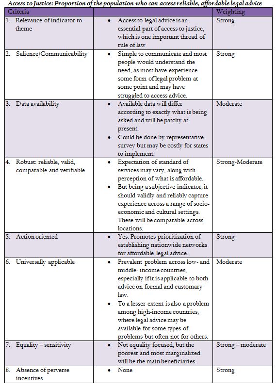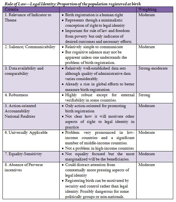 Although “rule of law” and “access to justice” seem like abstract concepts that would be difficult to measure, a simple indicator for the “access to justice” could be the proportion of the population who can access reliable, affordable legal advice should they need it, with “access” defined as living within three hours of a lawyer or paralegal provider (using standard available transit). Likewise, legal identity, as measured by the proportion of the population registered at birth, could be a reliable indicator for “rule of law.” Birth registration is often a precondition for obtaining formal identity documents such as passports and national ID cards, and therefore determines access to a wide range of fundamental social services and benefits, including healthcare and education. The tables below summarize how these two indicators meet important selection criteria.