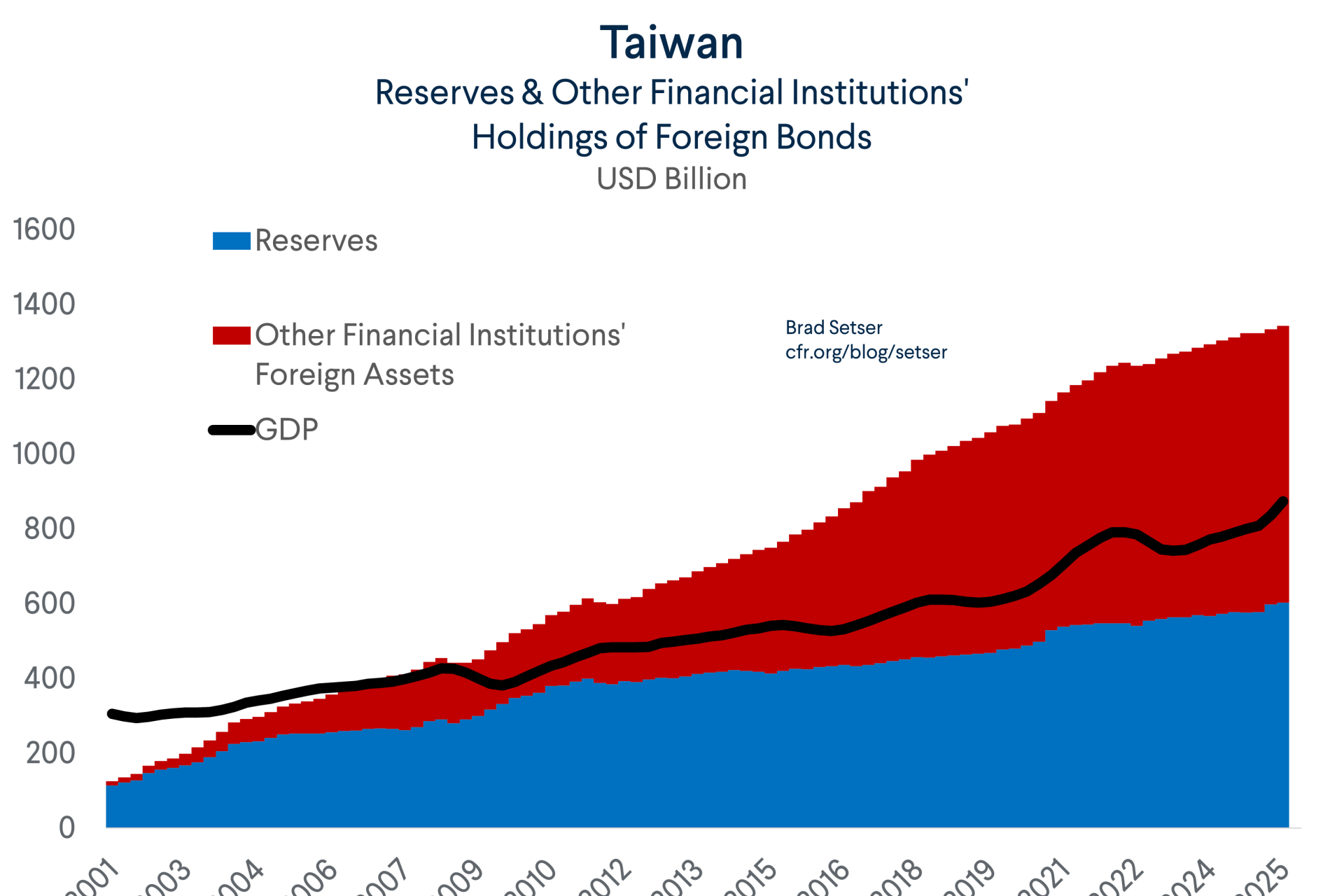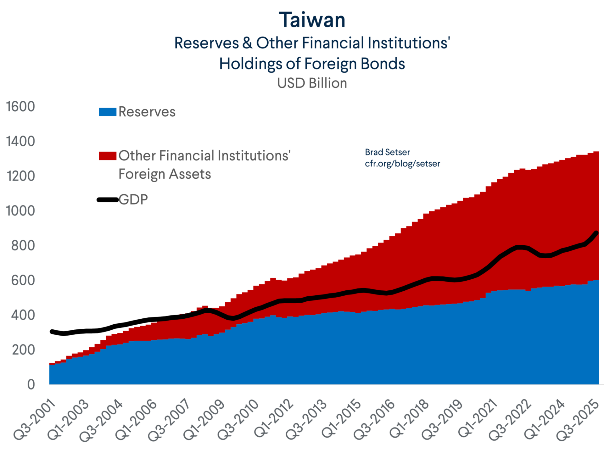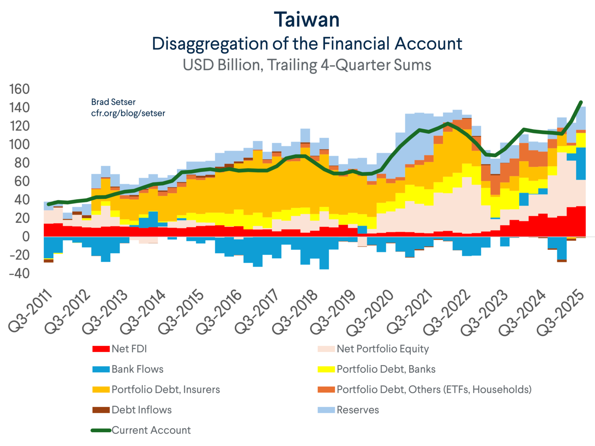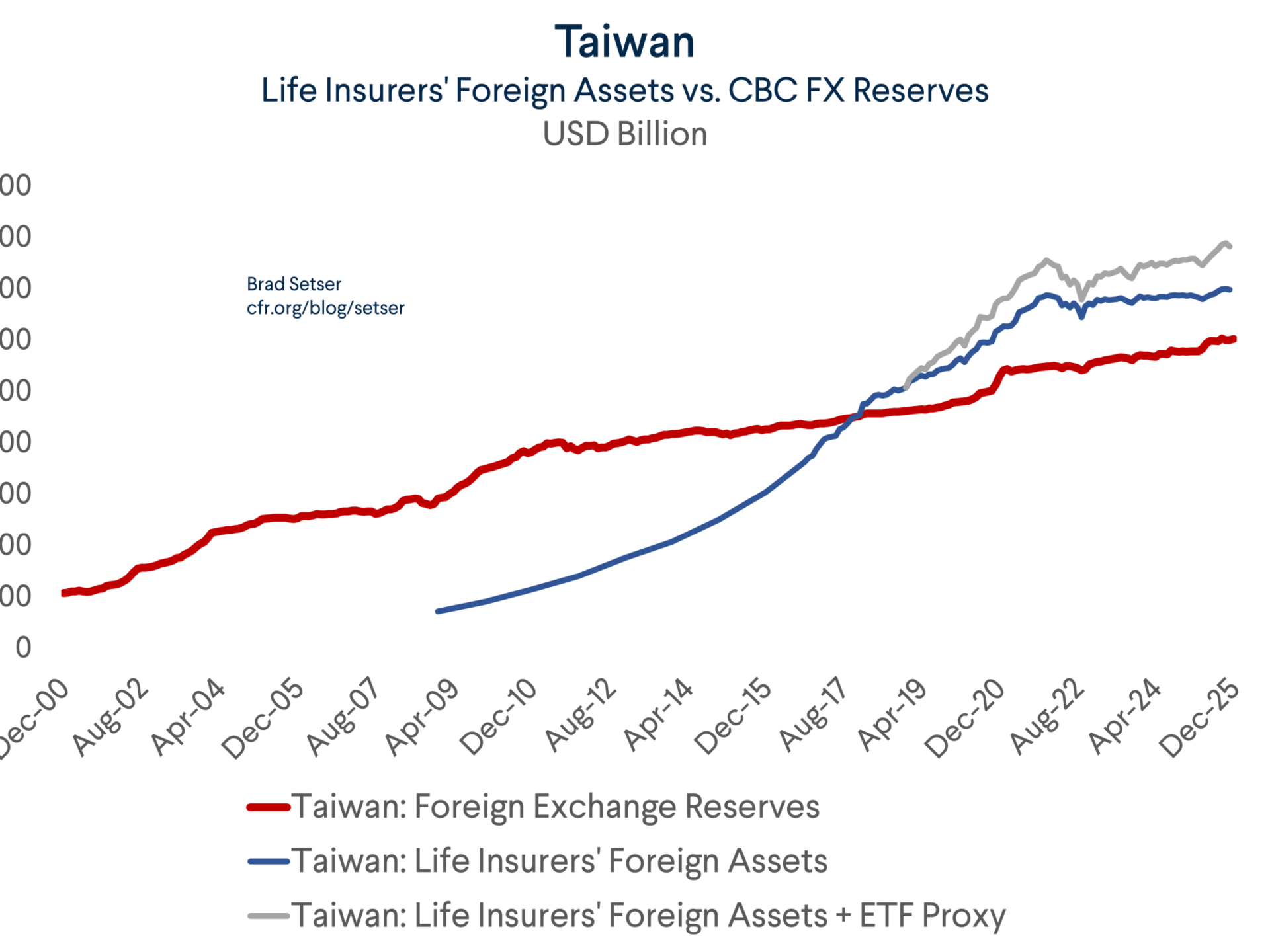 This accounting is indeed novel, as there is no theory stating that the foreign currency market should converge to TWD/USD spot from the time a bond was purchased (or from the time when it was moved into the hold to maturity portfolio). Sure, the Taiwan dollar has historically been rather stable (even though the CBC insists that it of course doesn’t target a level). But the Taiwan dollar is structurally quite undervalued on pretty much every measure and thus there is a strong case that the Taiwan dollar will eventually appreciate (reducing the TWD value of foreign currency bonds in the hold to maturity bucket at the time of maturity). Taiwan’s current account surplus has been around 15% of its GDP recently, and it is is if anything poised to rise toward 20% of GDP on strong demand for AI chips.