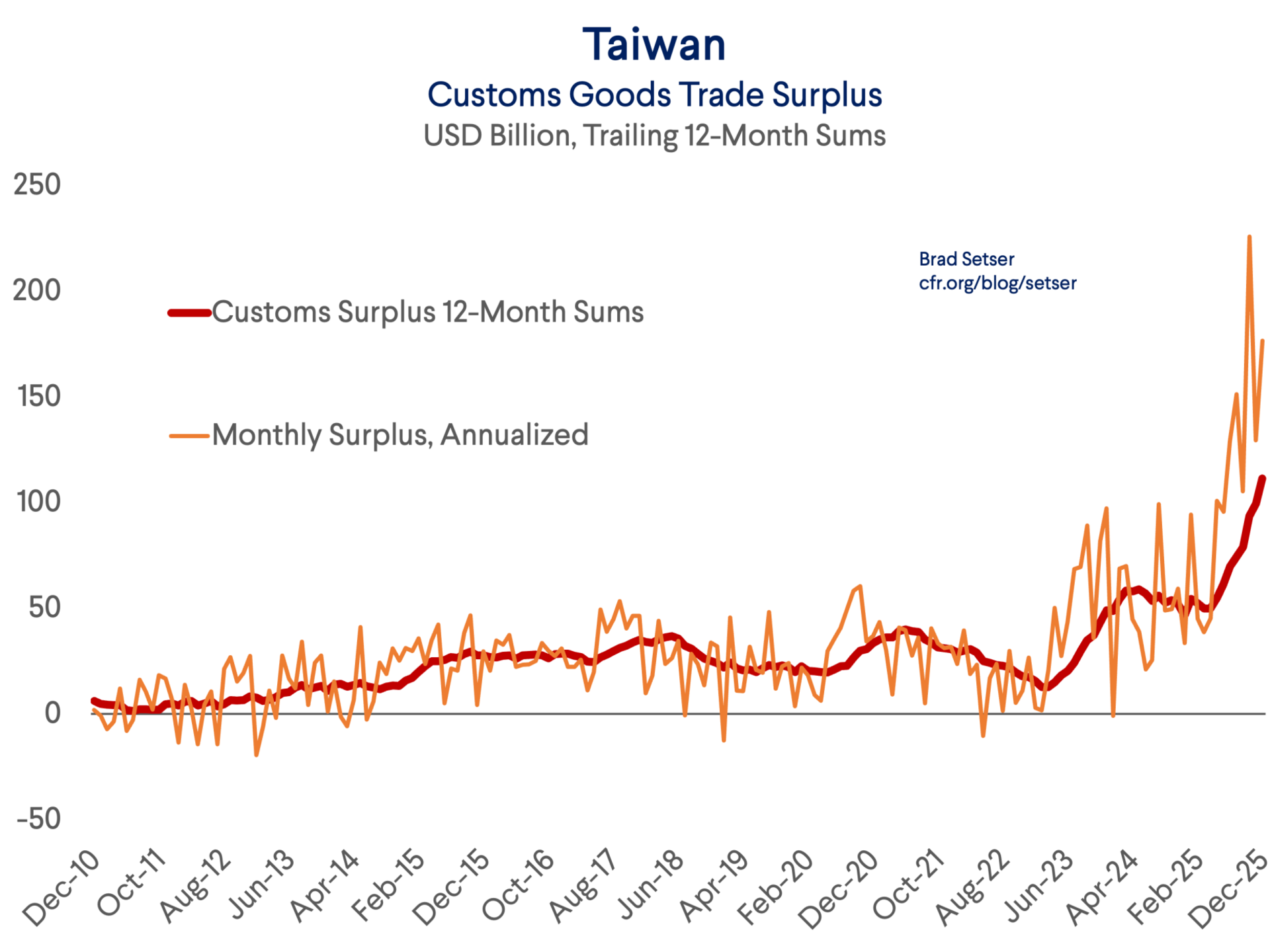 Taiwan’s trade surplus has soared. Absolutely soared. After being around $50 billion a year for most of the last decade, it is now running at a $150 billion or so rate in the fourth quarter, largely because TSMC makes the bulk of the world’s AI chips, and can command a premium for doing so.