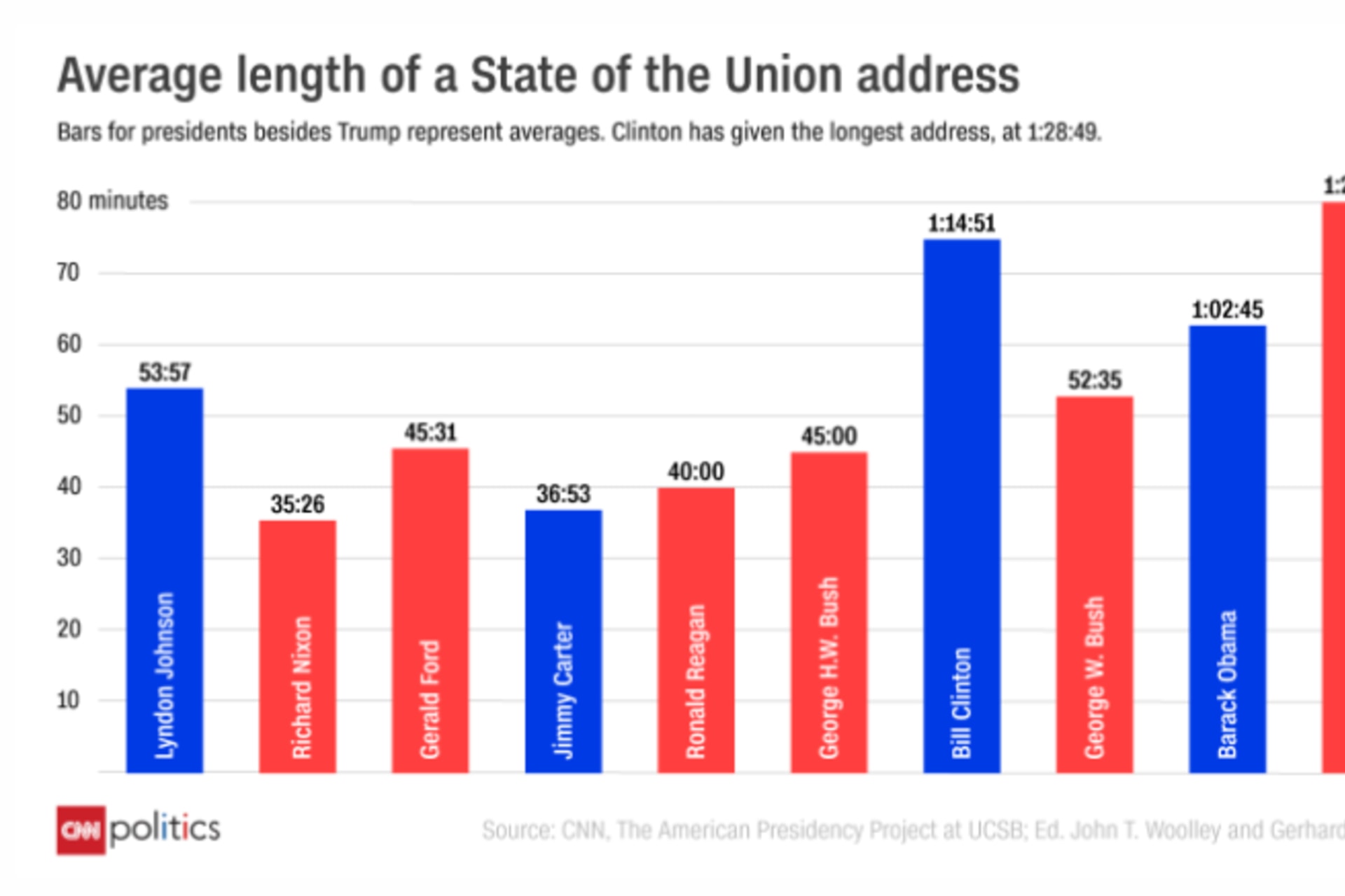 6. Some presidents go short in their State of the Union addresses, some go long, very long. Washington holds the record for brevity, using just 1,089 words in 1790. That’s slightly longer than a typical newspaper op-ed. Among presidents since LBJ, Richard Nixon holds the record for shortest State of the Union speech. His 1972 address clocked in at a shade under 29 minutes. Carter holds the record for the longest State of the Union address. His 1981 address, which he (thankfully) delivered to Congress in writing rather than in person, ran 33,667 words. (That’s the last time the State of the Union was delivered in writing.) Bill Clinton holds the record for the longest State of the Union address delivered in person, whether that is measured by the number of words (9,190 in 1995) or by the time it took to deliver (one hour, twenty-eight minutes, and forty-nine seconds in 2000). Trump’s 2017 speech to a joint session of Congress, which again wasn’t called a State of the Union address, ran 5,006 words and lasted one hour and ten seconds. He went longer in his 2018 State of the Union address, offering up 5,834 words and taking one hour and twenty minutes to deliver them. It was the third longest State of the Union address ever.