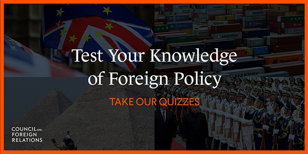 “CFR quizzes offer a fun and informative experience for all those interested in understanding today’s foreign policy agenda, from countries and issues in the news to historical events that continue to shape current debates. This effort—in addition to CFR’s other educational initiatives—aims to promote the knowledge and skills required to meet the challenges of the twenty-first century and to produce more informed citizens, which I believe is an essential part of our mission,” says CFR President Richard N. Haass.