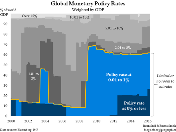 As our new CFR Global Monetary Policy Tracker shows, a record 23 countries—accounting for a quarter of world GDP—have central-bank policy rates of zero or less. A further six—including the United States—have policy rates of 1 percent or less. This means that the scope for monetary stimulus using conventional tools, policy-rate cuts towards zero, is—as the graphic above shows—non-existent or limited in nations accounting for 60 percent of the global economy.