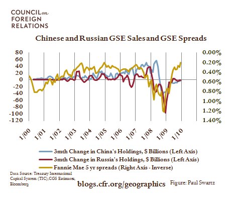 In his recently published memoir, former Treasury Secretary Henry Paulson claims that Russian officials approached the Chinese in the summer of 2008 suggesting that both countries sell large amounts of debt issued by U.S. Government-Sponsored Enterprises (GSEs), such as Fannie Mae and Freddie Mac, in order to pressure the United States into explicitly backing these companies. Paulson, who found the report “deeply troubling,” claims that China opted not to collaborate with Russia. Nonetheless, both countries dumped GSE debt that summer, as illustrated in the figure above. Russia sold $170 billion during 2008, while China sold nearly $50 billion between June 2008, when its holdings peaked, and the end of 2008. During this fire sale the yield spread between GSE debt and U.S. Treasury debt soared, as illustrated in the figure below. As GSE debt was widely used as collateral in the U.S. repo market, U.S. financial institutions were obliged to quickly pony up more securities to support their borrowing. This exacerbated the growing credit crunch. The U.S. government was forced to put the GSEs into conservatorship in September 2008. Secretary Paulson was more right than he realized to be concerned. The episode highlighted the clear risks to the United States, and indeed the wider world, of growing American dependence on foreign government lending.