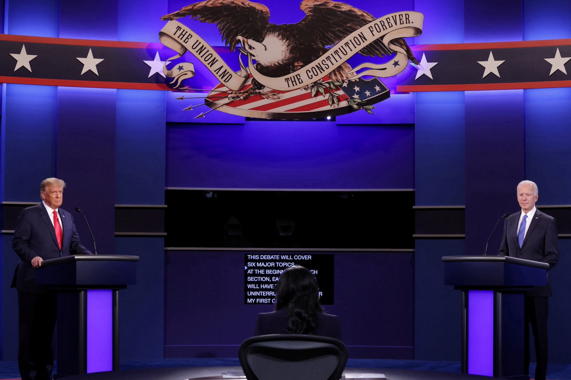 A wild card in all this is the debate’s structure. There will be no audience. So Bash and Tapper won’t be repeatedly asking people to quiet down. Neither Biden nor Trump will be allowed to bring props onstage, though they will be allowed a pen, a pad of paper, and a bottle of water. Both candidates will stand at a podium, and there will be one commercial break. Perhaps most consequentially, CNN will mute each candidate’s microphone when their time is up. So the crosstalk that dominates—and frequently undermines—most debates should diminish.