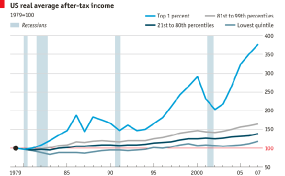 Chart of the Week. The Occupy Wall Street movement has made the phrase “the 99 percent” the hottest new political buzzword. So just how different has the experience of the top 1 percent been from everyone else’s over the past decade? As the chart below shows, when it comes to real-income growth—that is, after accounting for the effects of inflation—the difference is substantial. The three decades after 1979 were spectacularly good ones for the top 1 percent of wage earners, even with the 2000-2001 tech crash. In comparison, the bottom 80 percent of wage earners were only marginally better off in 2007 than they were in 1979—and much of that gain was probably lost in the wake of the 2008-2009 financial crash. Whether one is impressed by the gap between the top 1 percent and everyone else, or by the fact that the trend lines for everyone but the top 1 percent are relatively flat, the chart provides some indication of why so many Americans are pessimistic about the direction of the country, and have been for quite some time.
