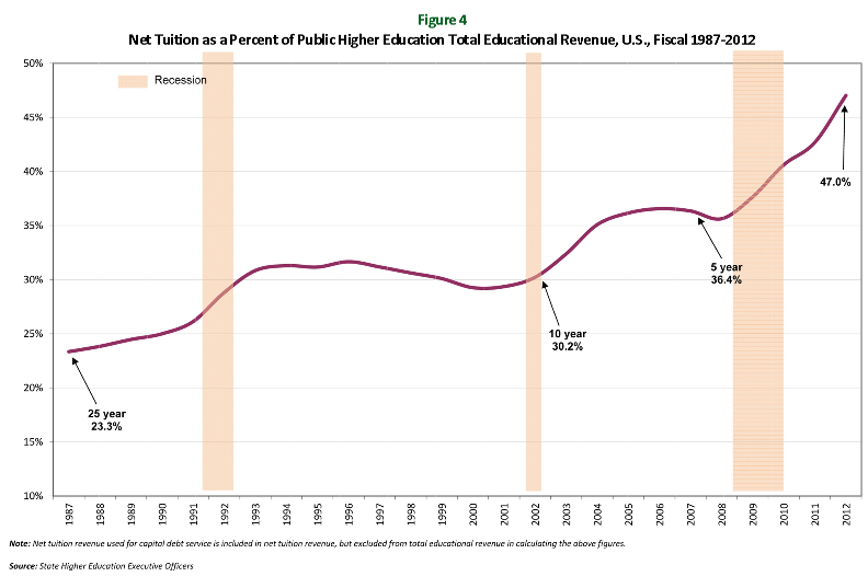 These figures are driven most immediately by the lingering effects of the financial crisis of 2008-2009. But they also reflect a decades long trend in the United States by which students are paying a larger and larger share of their higher education costs. As the figure below shows, in 1987 tuition generated roughly a quarter of all educational revenue. Today it accounts for nearly half of it.