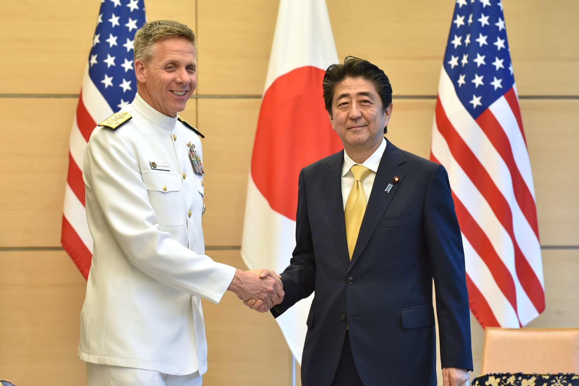 Admiral Phil Davidson, commander of U.S. Indo-Pacific Command, shakes hands with Japan’s Prime Minister Shinzo Abe at Abe’s office in Tokyo, Japan. Reuters/Kazuhiro Nogi
