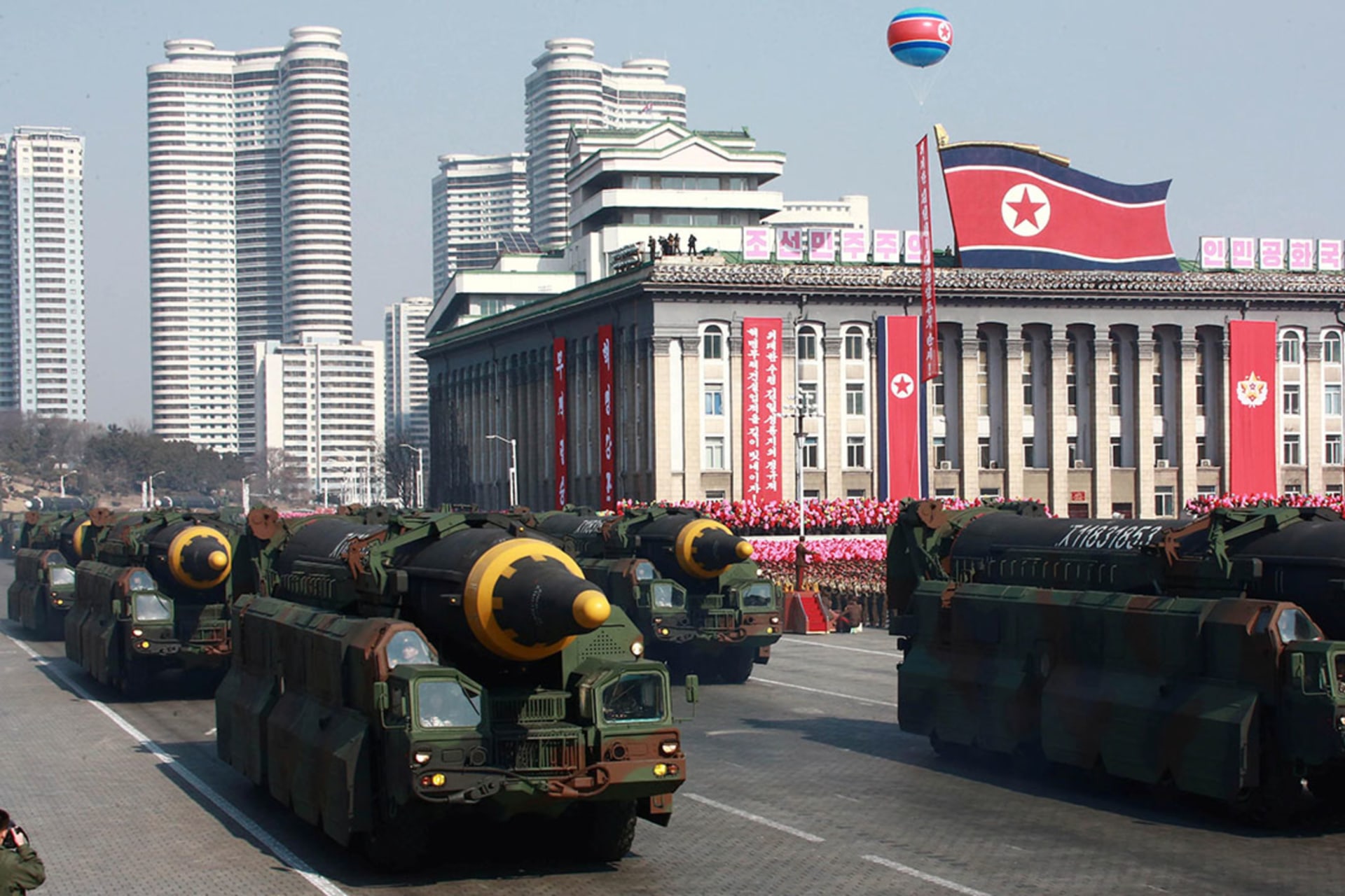North Korea parades Hwasong-12 intermediate-range ballistic missiles during a 2018 military parade. KCNA