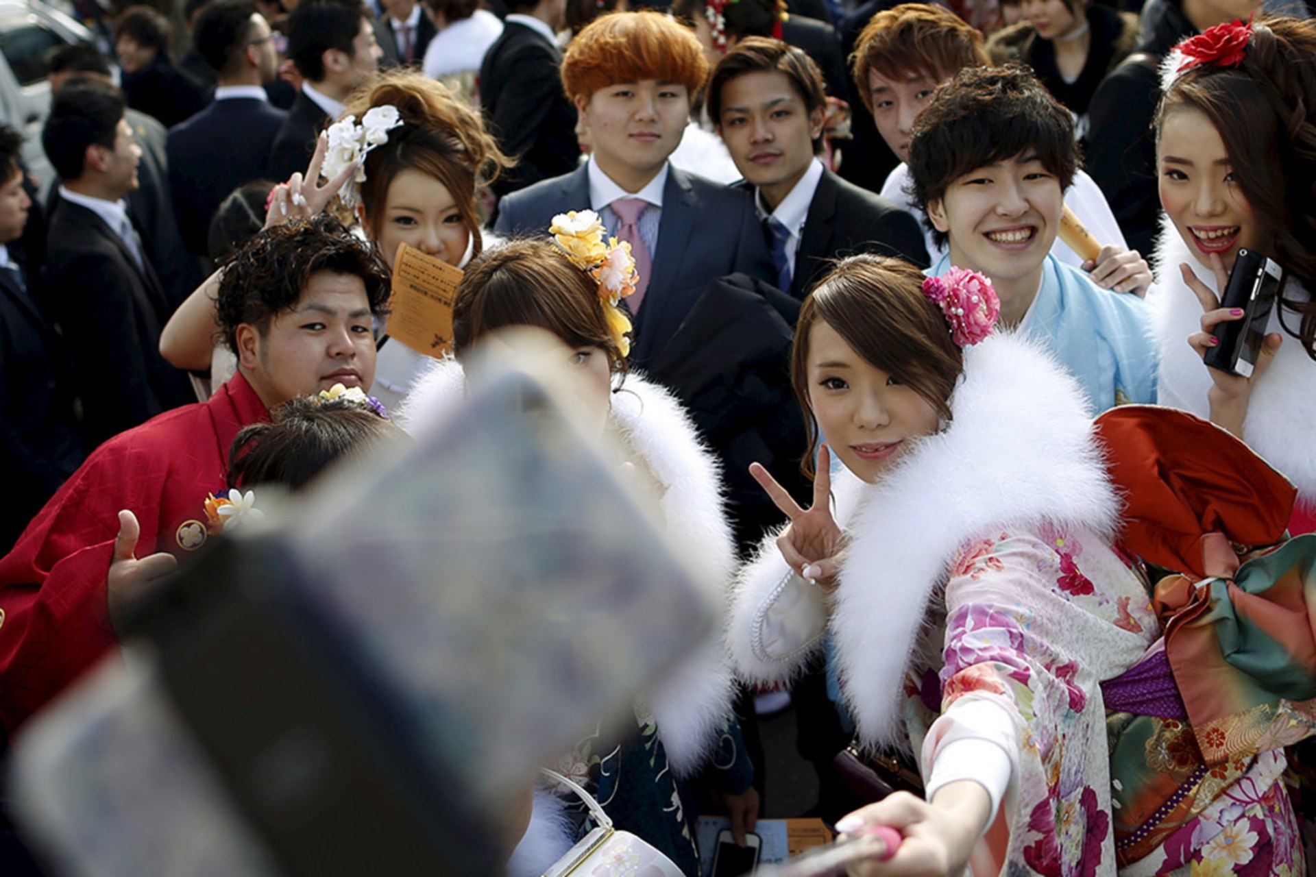 Young people pose for selfies in a park in Tokyo. Yuya Shino/Reuters