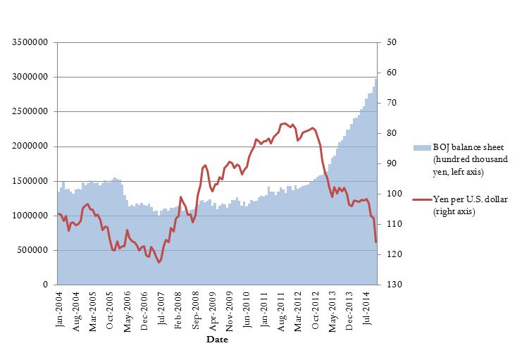 Figure 1: The Dollar–Yen Exchange Rate and the Bank of Japan’s Balance Sheet