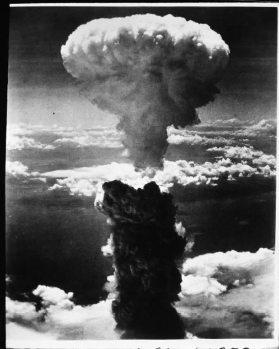 Smoke rises over Nagasaki after the atomic bombing, August 9, 1945. Courtesy of the National Archives and Records Administration/United States Army Air Forces.