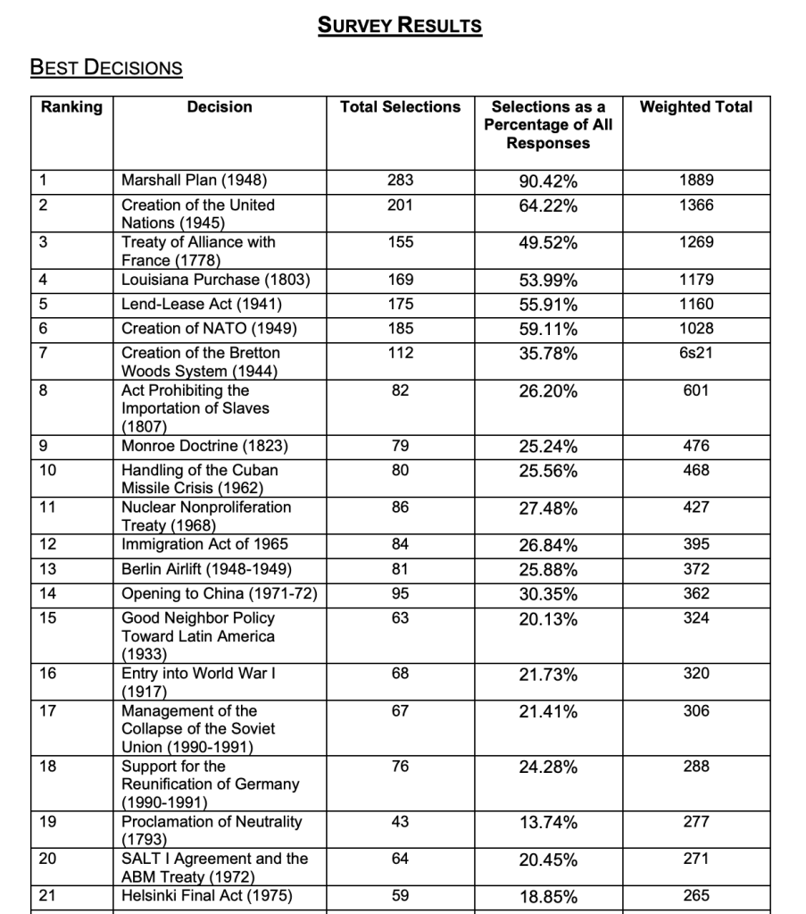 The survey consisted of two substantive questions. First, SHAFR members were asked to select ten decisions from a list of 120 foreign policy decisions that in their “judgment did the most to advance U.S. national interests and values.” Respondents had the option of reviewing the complete set of decisions before making their decisions. Second, SHAFR members were asked to review the same 120 foreign policy decisions and select the ten decisions that in their “judgment did the most to harm U.S. national interests and values.” Respondents similarly had the opportunity to review the list of decisions before making their selections. The list of decisions was the same for both questions.