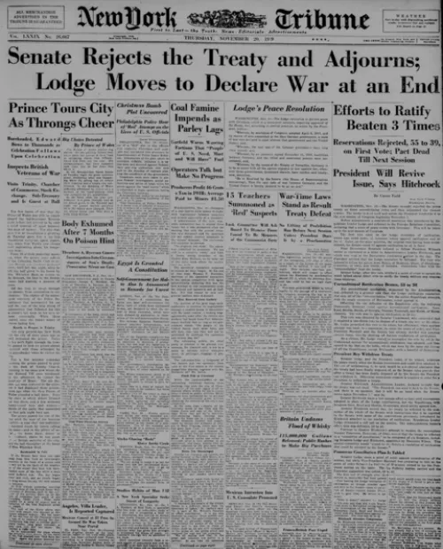 The U.S. entry into World War I broke with the United States’ longstanding practice of keeping out of Europe’s political affairs. President Woodrow Wilson saw that shift as an opportunity to try to restructure world politics to make future conflict less likely. He went to Paris in December 1918 to negotiate the war’s end. There he negotiated the Treaty of Versailles, which embraced his vision to create a League of Nations that would work to preserve peace. Wilson did not have similar success, however, at home. In November 1919 and again in March 1920, the Senate rejected the Treaty of Versailles, and with it, the League of Nations. The league began operating in 1920, but the absence of the United States handicapped its work. Declining to join the league also made it easier for the United States to ignore growing world crises over the next two decades, a decision it would come to regret. SHAFR historians ranked the Senate rejection of the Treaty of Versailles as the fifth-worst U.S. foreign policy decision.